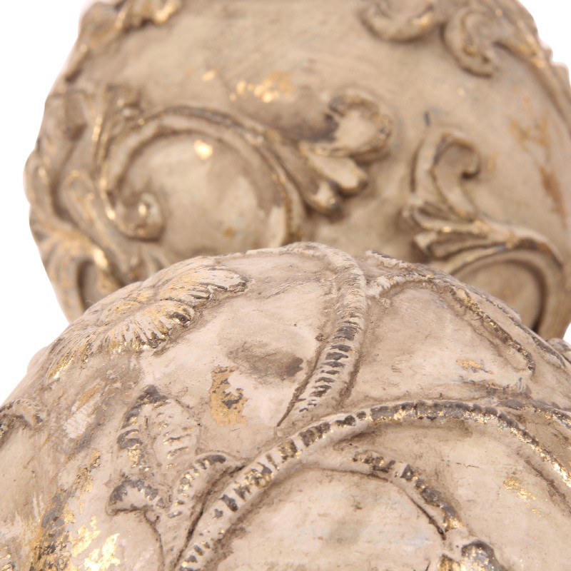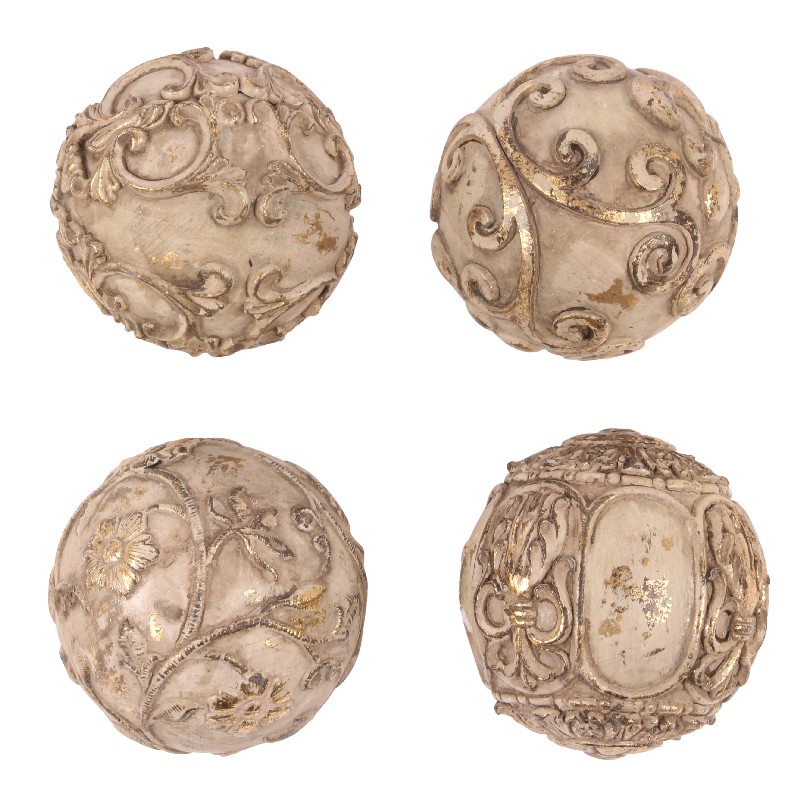 Nice vintage beige coloured decoration balls, made of polyresin. Create a nice atmosphere in your home by decorating with items like this deco balls. Very nice to decorate together on a tray or in a bowl. Price is per piece and they are packed per 4 different designs, 3 pieces each.